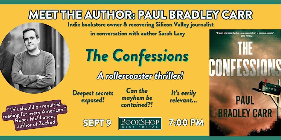 Next Tuesday at 7pm I’ll be at BookShop West Portal in San Francisco talking about The Confessions, AI madness, and more.