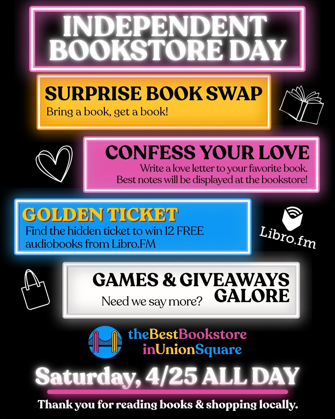 The GOLDEN TICKET thing is particularly fun - if you find a golden ticket (an actual gold-colored ticket) hidden somewhere in the store tomorrow, you’ll win a YEAR’S WORTH of free audiobooks from Libro.fm.