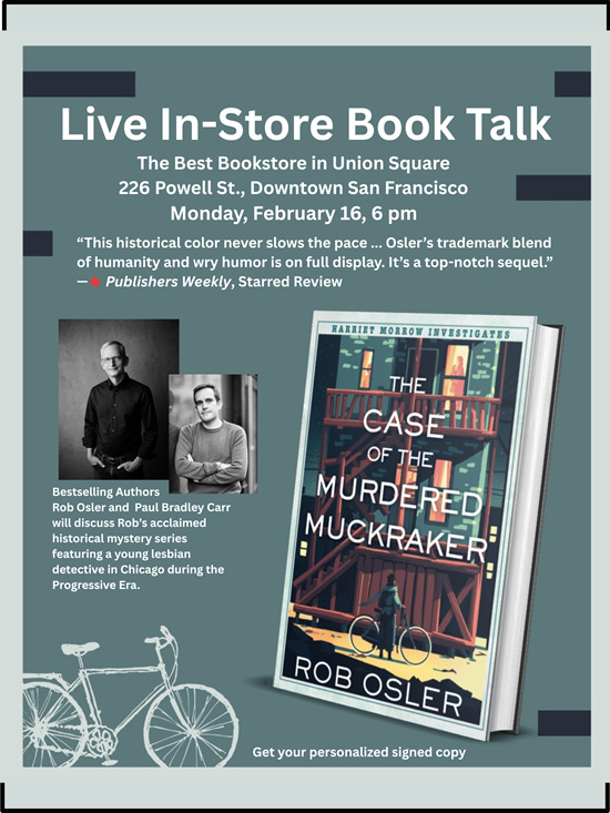 In the meantime, a quick reminder that TOMORROW (Monday) at the Best Bookstore in Union Square (226 Powell St, San Francisco) I’m interviewing bestselling mystery author (and one of my favorite people in the world) Rob Osler about his latest book THE CASE OF THE MURDERED MUCKRAKER.